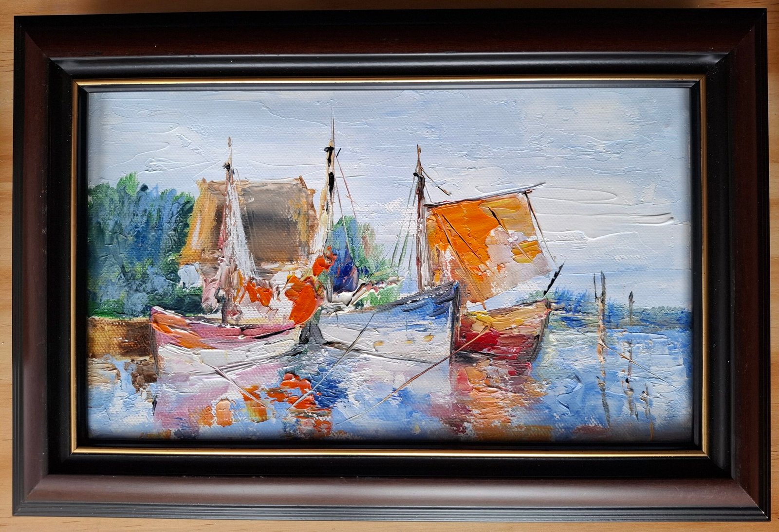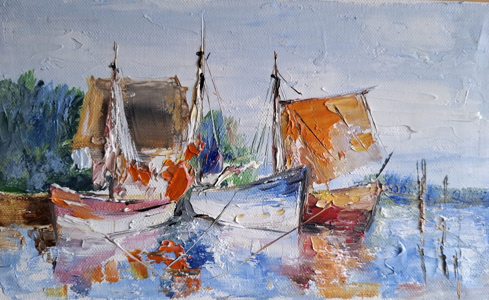 Trei bărci cu vele, pictate în tușe groase și vibrante, se odihnesc în apele calme ale unui golf liniștit. Culorile lor — roșu, alb, albastru și portocaliu — se reflectă în apă ca într-un vis lichid, creând o simfonie vizuală de lumină și mișcare. Velele par ușor uzate, dar pline de caracter, ca niște martori ai vânturilor trecute.