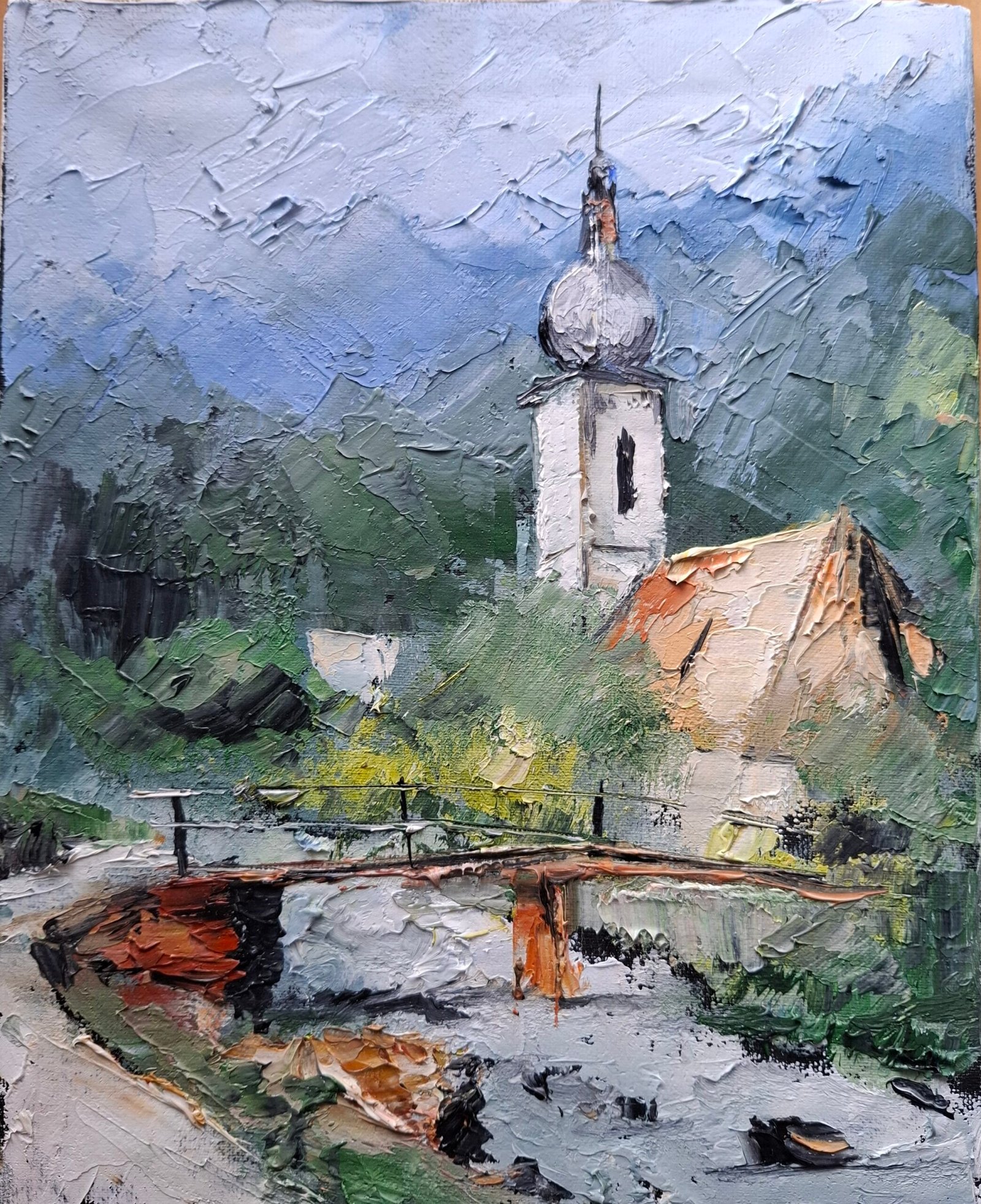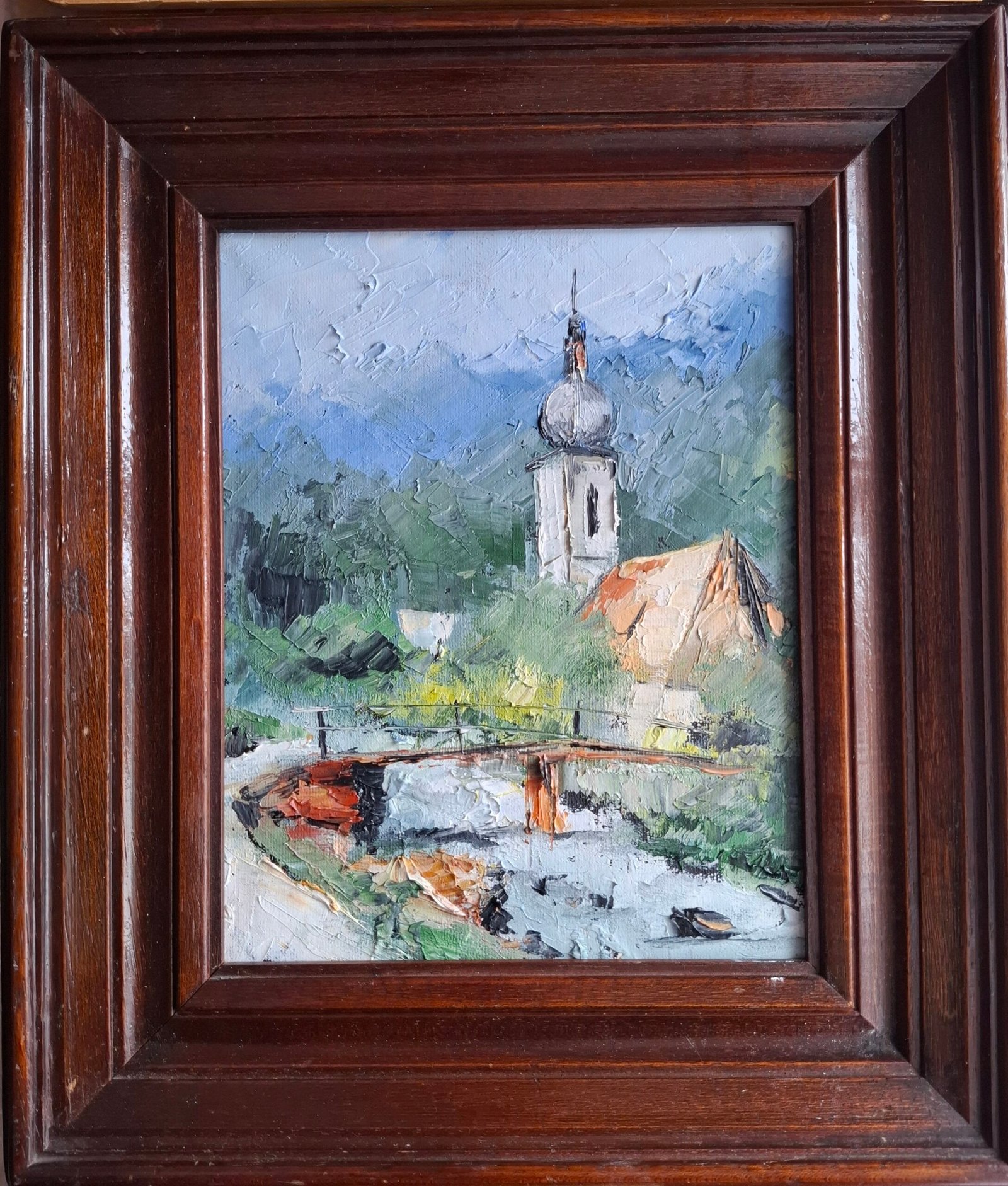 Această pictură în ulei, realizată cu tușe groase și expresive, surprinde o scenă de sat transilvănean învăluită într-o atmosferă de liniște și reflecție. În centrul compoziției se află o biserică albă cu turn în formă de bulb, simbol al spiritualității și al rădăcinilor profunde. Podul de lemn din prim-plan, arcuit peste un pârâu liniștit, pare să invite privitorul într-o călătorie interioară — o trecere simbolică spre lumină, tradiție și armonie.