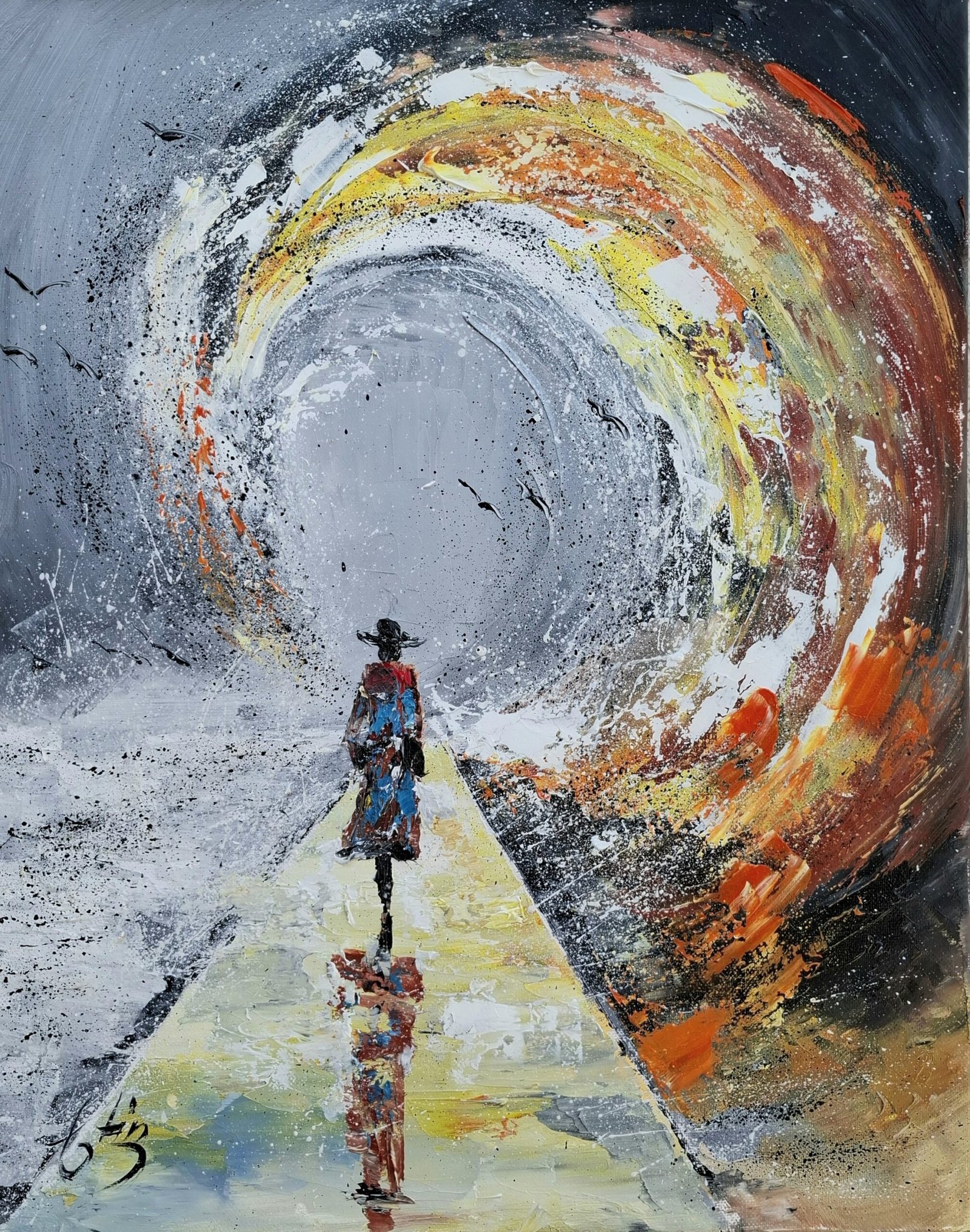 Această lucrare abstractă și onirică explorează tema tranziției interioare și a curajului de a păși în necunoscut. Un personaj solitar înaintează pe un coridor cromatic, îndreptându-se spre un vortex tumultuos de culoare și mișcare — o metaforă vizuală pentru transformare, renunțare sau renaștere.