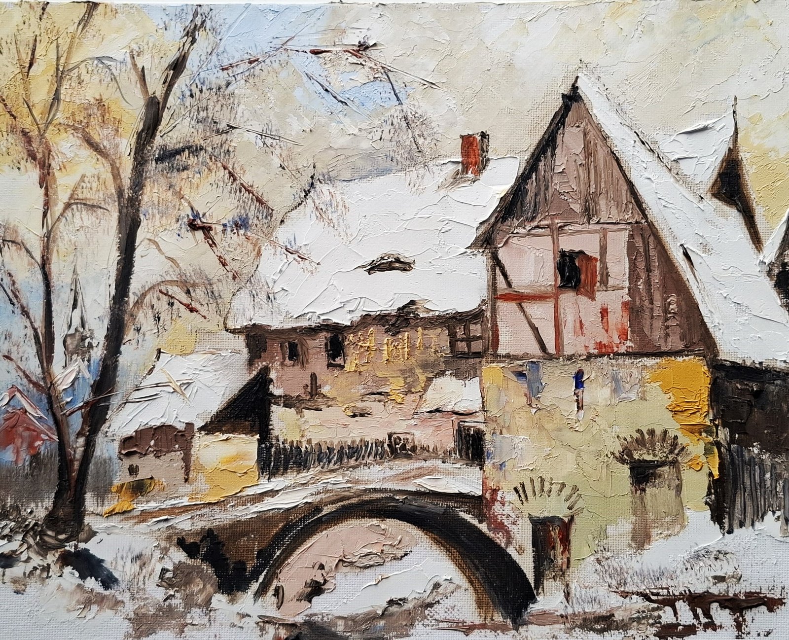 În această lucrare, iarna îmbracă orașul medieval într-o mantie albă, liniștită și misterioasă. Casele vechi, cu acoperișuri încărcate de zăpadă, păstrează ecoul vremurilor trecute, iar podul devine un simbol al legăturii dintre epoci și destine. Atmosfera este una de tăcere solemnă, unde frigul și lumina difuză se transformă într-o poveste vizuală despre memorie, timp și frumusețea efemeră a anotimpului.