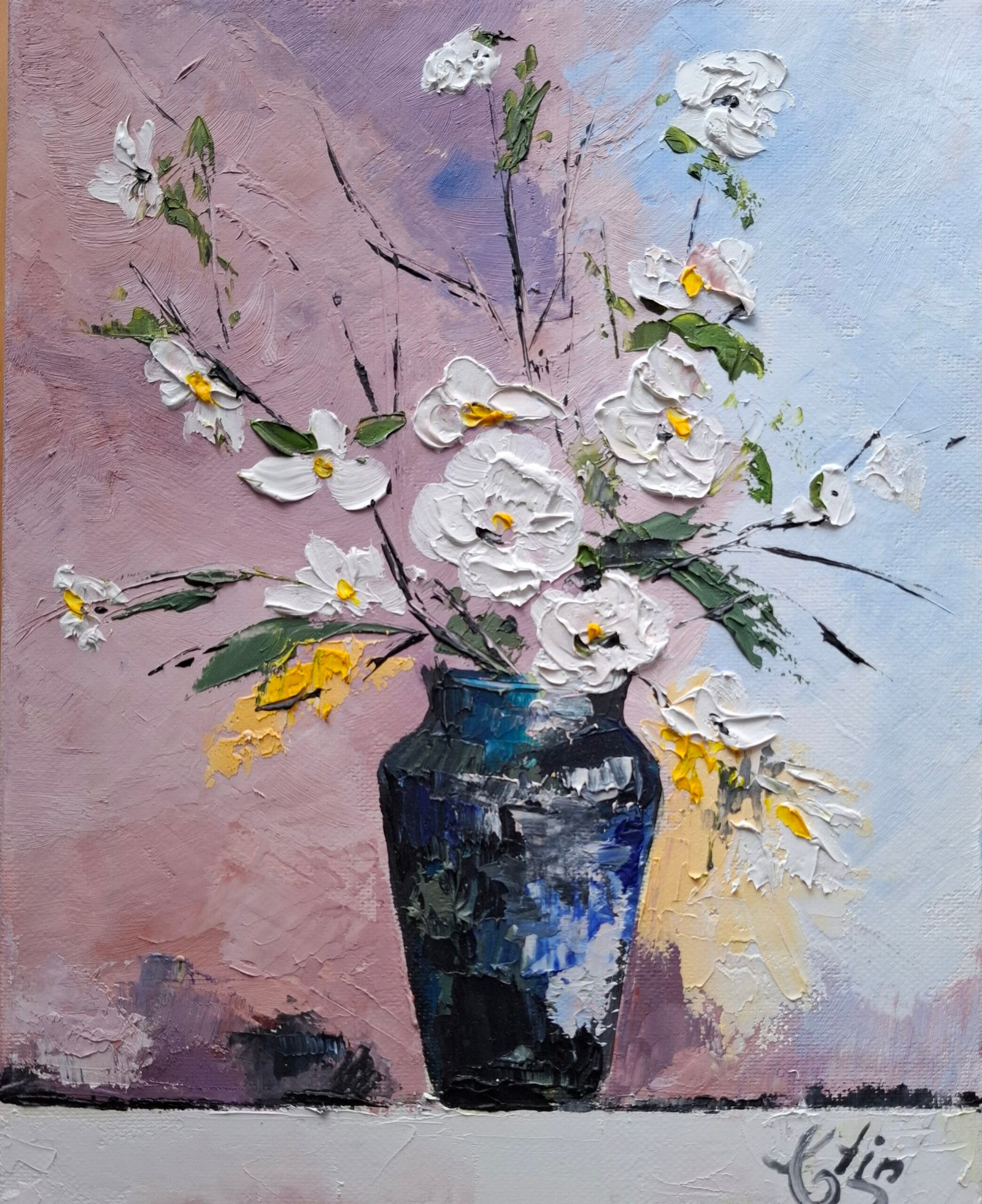 Această compoziție florală, realizată în impasto expresiv, surprinde o clipă suspendată între vis și realitate. Florile albe cu inimi galbene par să respire lumină, în timp ce ramurile fine și frunzele verzi se arcuiesc într-un dans silențios. Vasul albastru închis ancorează compoziția, contrastând cu fundalul eteric în nuanțe de violet, roz și albastru — o paletă ce evocă liniștea unui amurg interior.