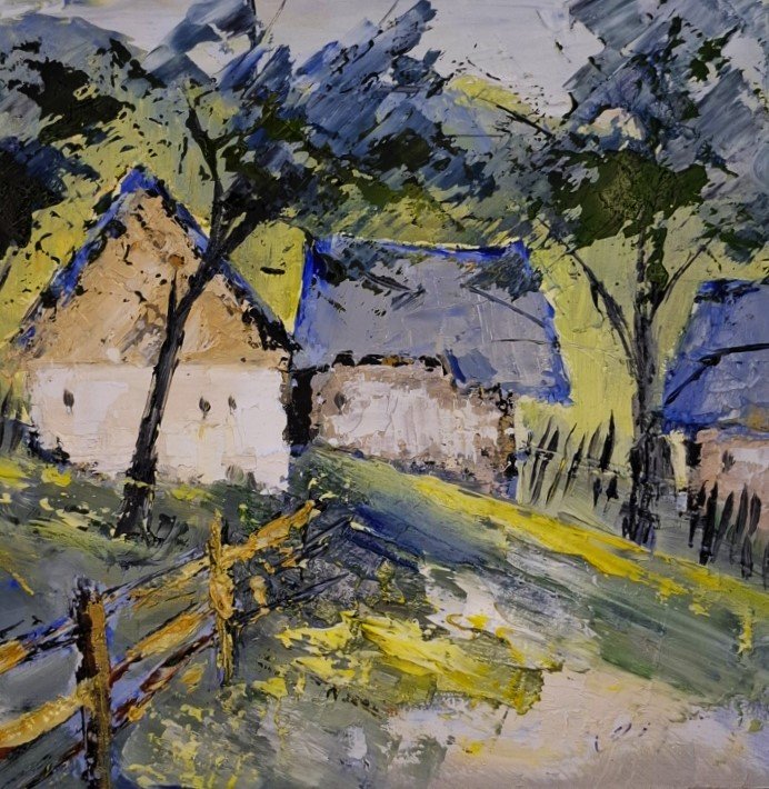 Tabloul surprinde un colț de sat din Făgăraș, vara, cu trei case așezate pe o pantă. Compoziția transmite echilibrul dintre arhitectura tradițională și peisajul montan, evocând liniștea și frumusețea vieții rurale. Lumina verii îmbracă scenele în căldură și vitalitate, iar perspectiva în pantă sugerează dinamism și legătura organică dintre om și natură.