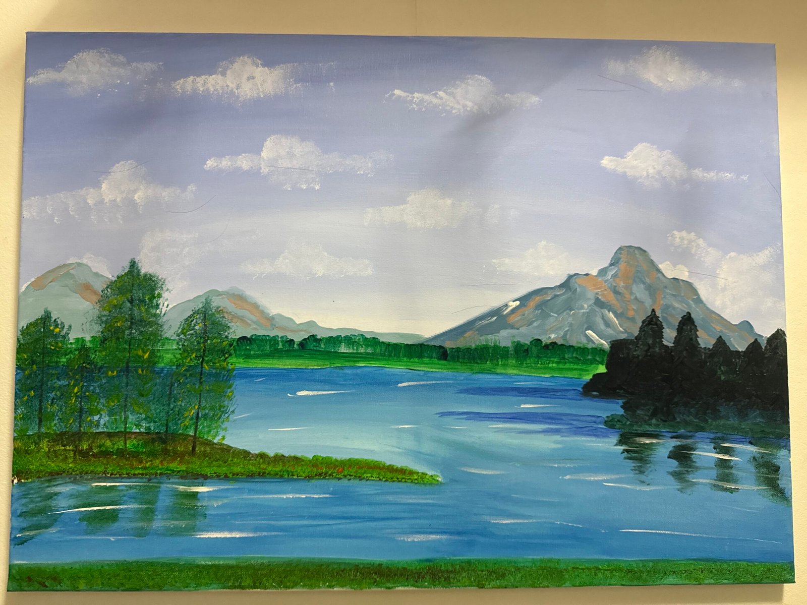Este un peisaj natural dominat de un lac liniștit, ale cărui ape albastre reflectă cerul senin și norii pufoși. În fundal se ridică munți impunători, cu vârfuri ușor atinse de tonuri calde, care contrastează cu verdele intens al pădurii din jur. În partea stângă, câțiva copaci subțiri cresc pe o mică limbă de pământ ce înaintează în apă, iar în dreapta se vede o zonă mai umbrită, cu brazi înalți și deși. Cerul este deschis, luminos, presărat cu nori albi, oferind întregii compoziții o atmosferă calmă, curată și aerisită.