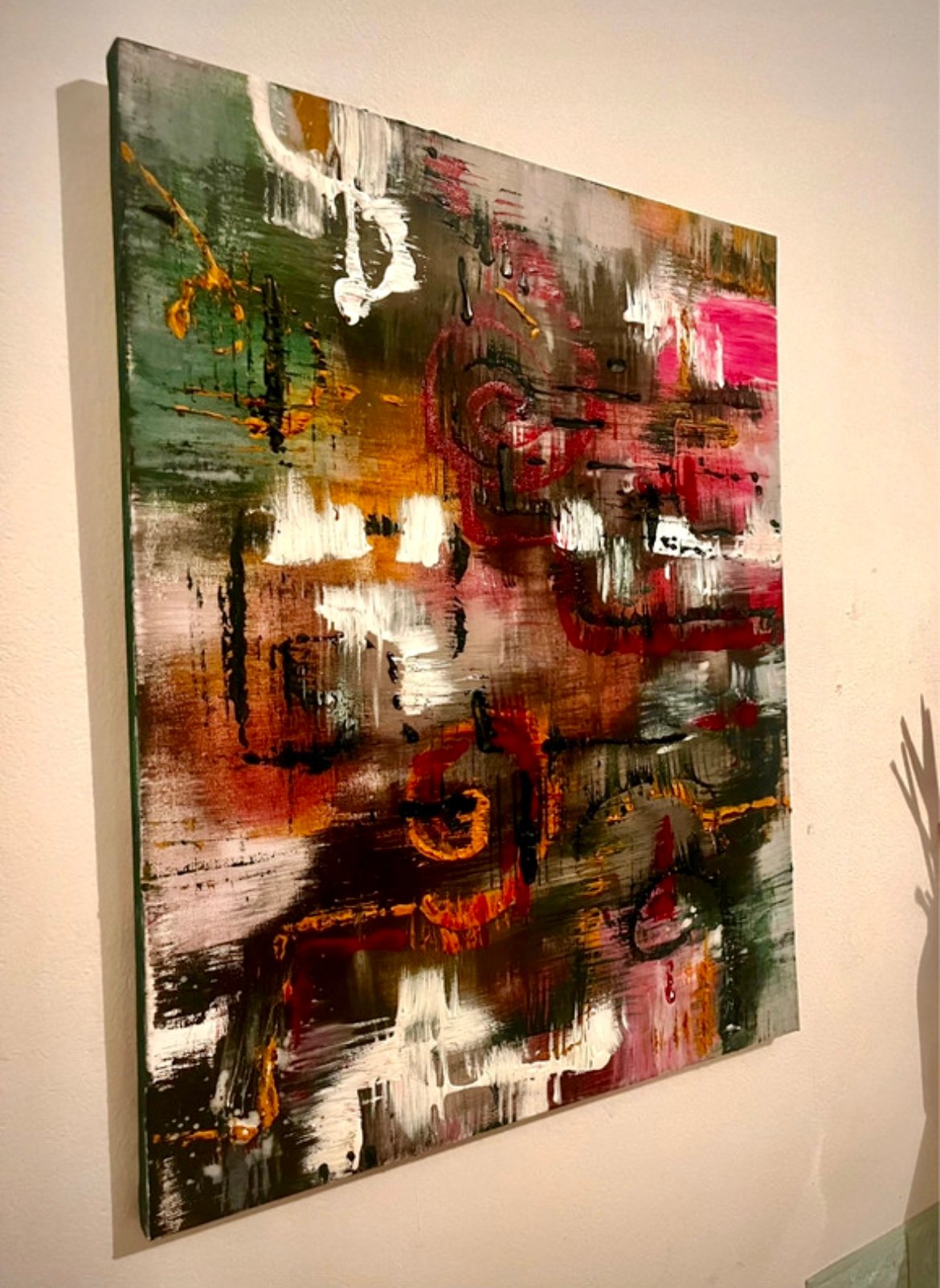 tablou abstract pictat in ulei,cu nuante de verde,roz,alb,negru si galben ofera o profunzime de nedescris.Compozitiile dinamice si culorile vii creeaza o atmosfera vibranta si expresiva.O piesa unica,care adauga o nota de originalitate si creativitate in orice spatiu