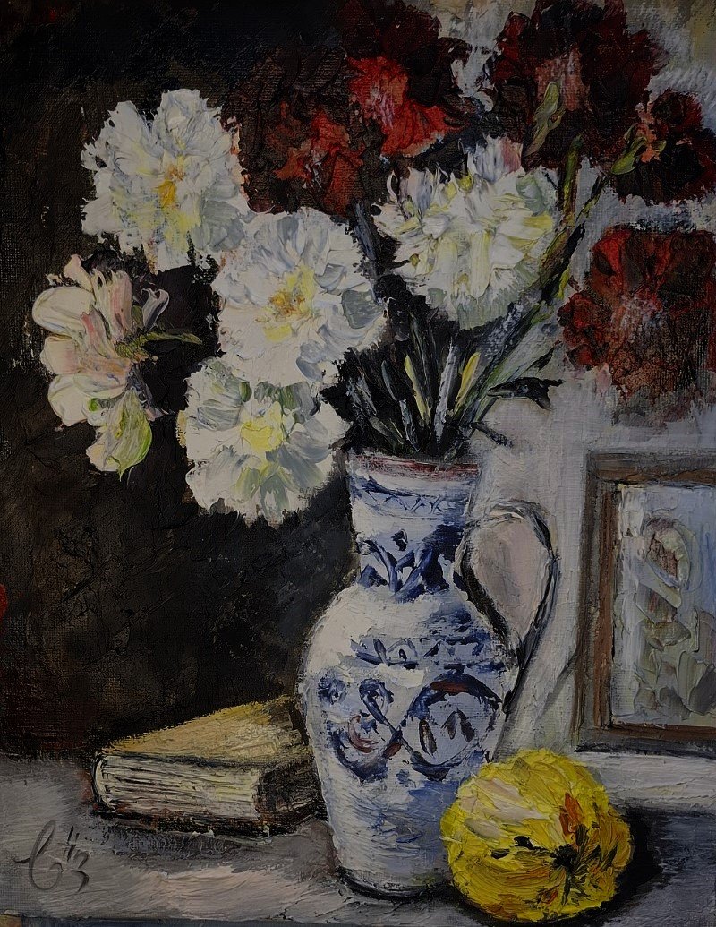 Tabloul surprinde o compoziție intimă și echilibrată: garoafe delicate așezate într-o vază, alături de o gutuie aurie și o carte. Între cele trei elemente se creează un dialog vizual și simbolic — florile evocă fragilitatea și efemerul, fructul aduce vitalitate și prospețime, iar cartea sugerează cunoaștere și reflecție. Împreună, acestea transmit o atmosferă de liniște contemplativă, unde frumusețea naturii și universul spiritului se întâlnesc într-un cadru armonios.